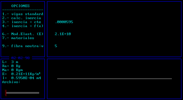 Pulsando F6 se introduciran los valores físicos de la viga que deben utilizarse en el calculo: momento de inercia, módulo de elasticidad y distancia a la fibra neutra, con la posibilidad de importar datos desde el prontuario de vigas incorporado.